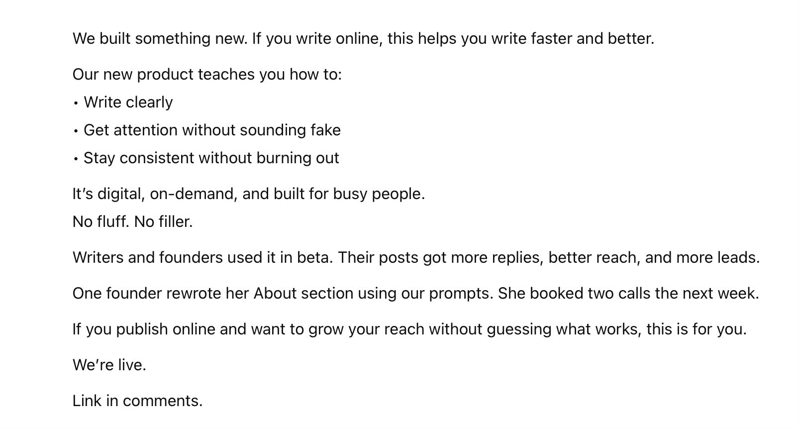 I developed a prompt that strips away AI writing habits and creates more natural text. When I applied it to the same LinkedIn post request, the difference was dramatic: